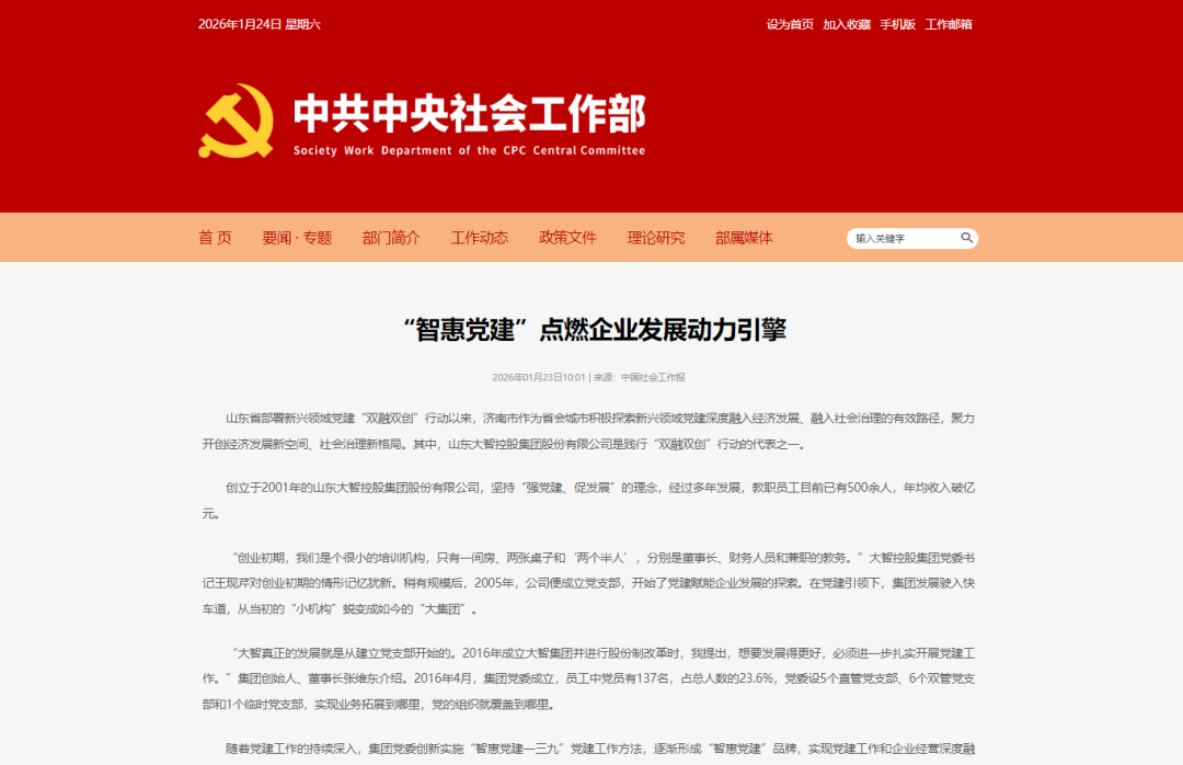 1月23日,中共中央社会工作部官方网站以《“智惠党建”点燃企业发展动力引擎》为题,专题报道大智以党建引领企业发展的创新探索与实践成果。原文如...