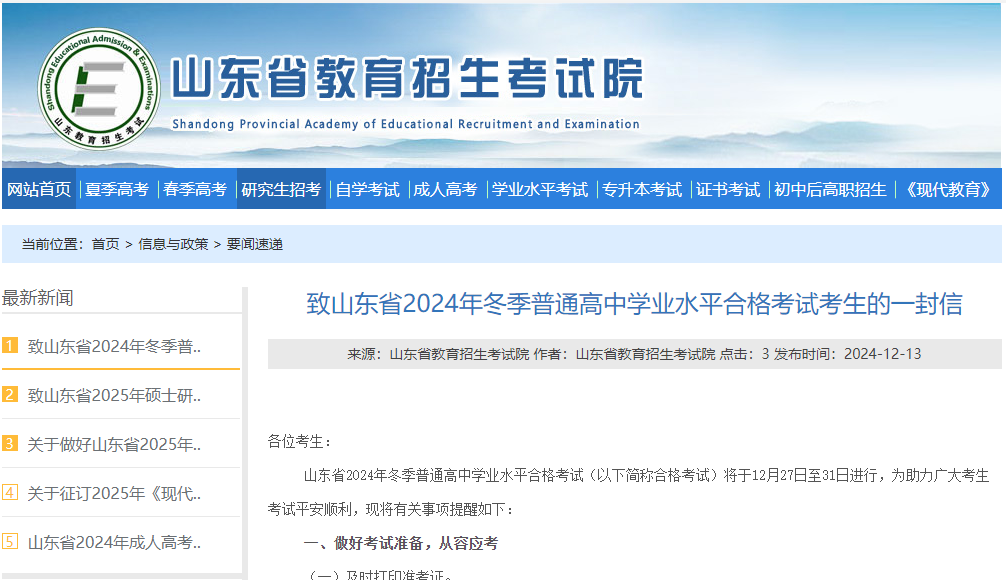 山东省教育招生考试院发布《致山东省2024年冬季普通高中学业水平合格考试考生的一封信》提醒各位考生,请考生在规定时间登录报名系统自行打印准考证,打印时间为:12月20日—12月25日每天9:00—17:00,12月26日—12月31日每天7:00—20:00。