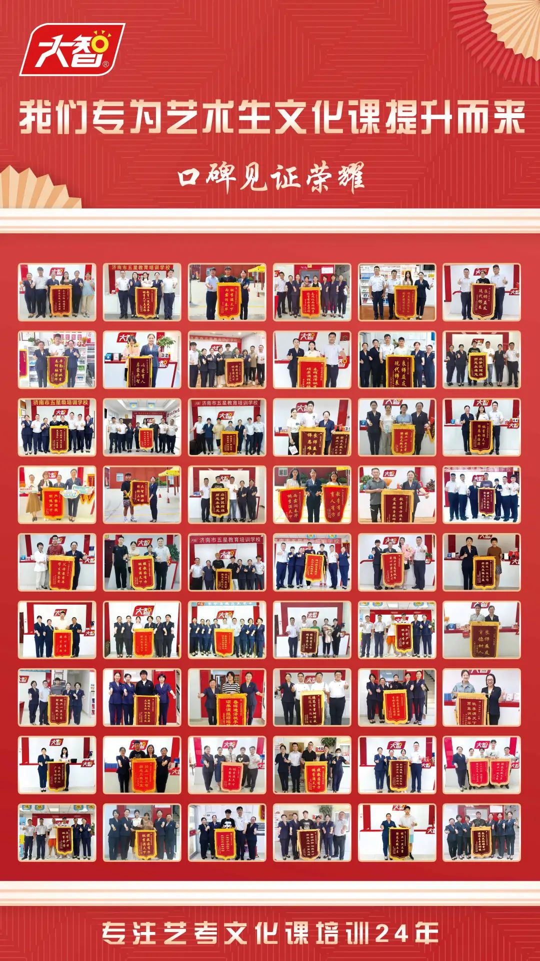 一面面锦旗见证大智教学实力。大智的教研成果得到了《大众日报》《齐鲁晚报》《半岛都市报》、山东电视台、齐鲁电视台等主流媒体广泛关注,曾先后荣获“中国社会组织评估4A级单位”“山东省消费者满意单位”及“山东省著名商标” 等荣誉,受到学生和家长的好评。